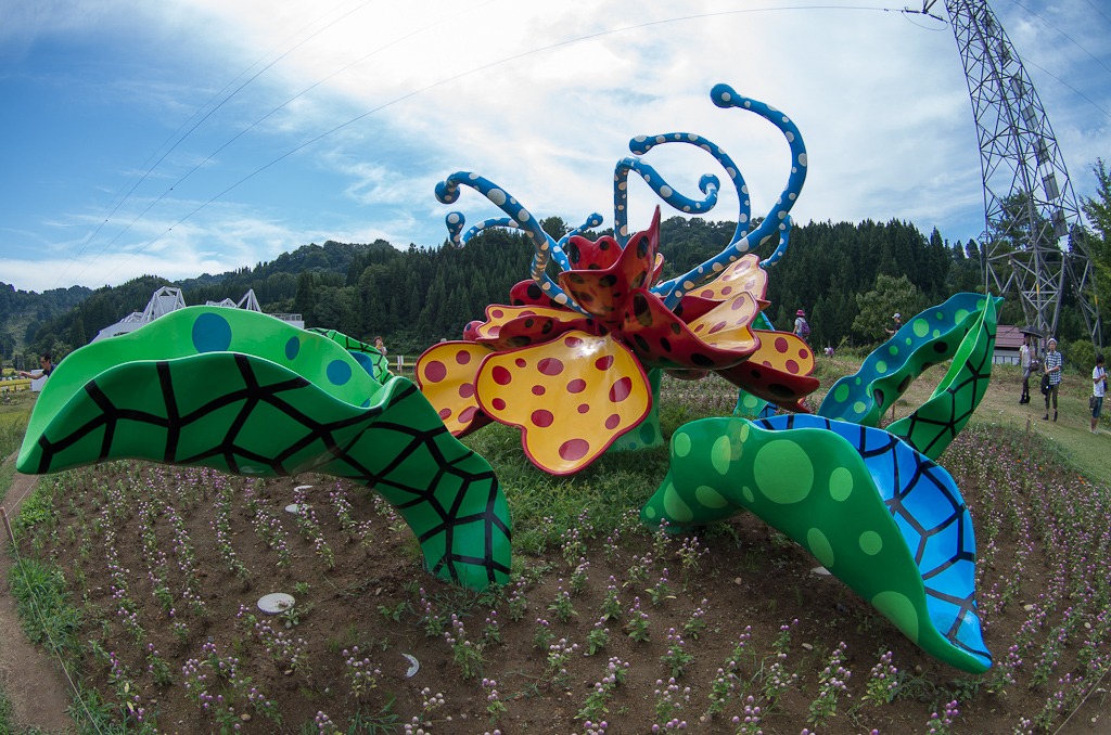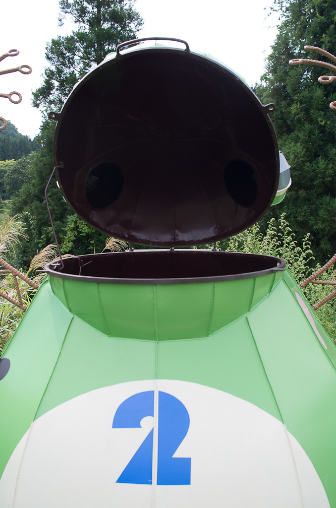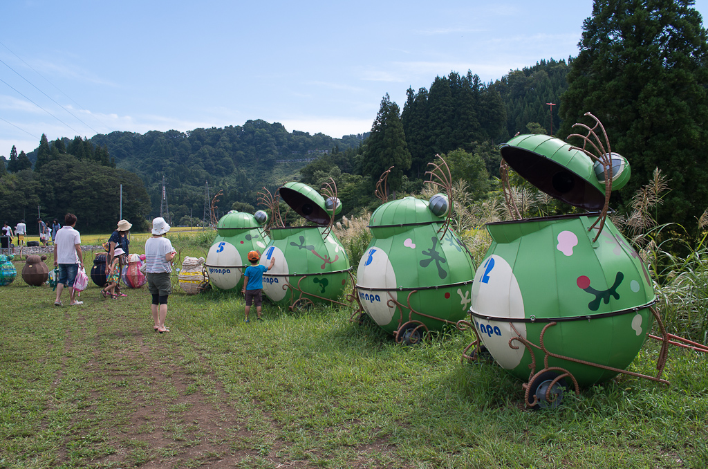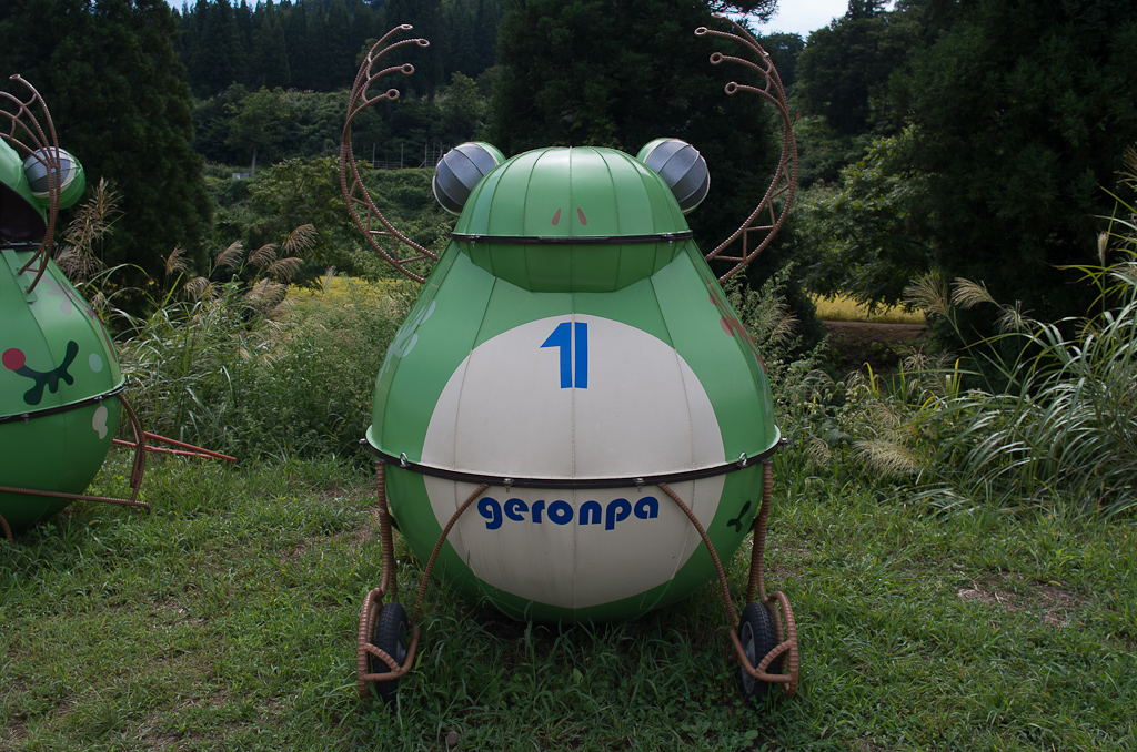 投稿日: 2012年9月9日2012年9月19日 投稿者: おフクぼくのなつやすみ -2日目 前編- とりあえず現物を見てみたかった作品に。 どん!! ホント無造作だから困る。 しかしこれ、普段はどうしてるんだろ? 常設展? 魚眼でどん!! ゆがみとか何かそういうのを感じさせないぐらい元々歪んでる(笑) このカオスなセンスは凄いと思う。 まだまだ農舞台の周りには作品がいっぱい!! カエル発見!! ここはカエルの天国や~!! 実はこの口の中に、刈り取った穀物を入れる事が出来るようになっている実用品。 一台欲しいけど、スペースも入れとく穀物も無いや。 小さいカエルたちも!! これなら置くスペースあるかも!! ページ: 1 2 3 4