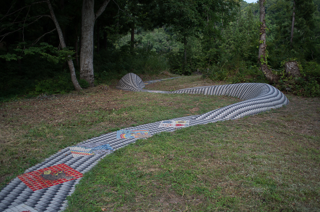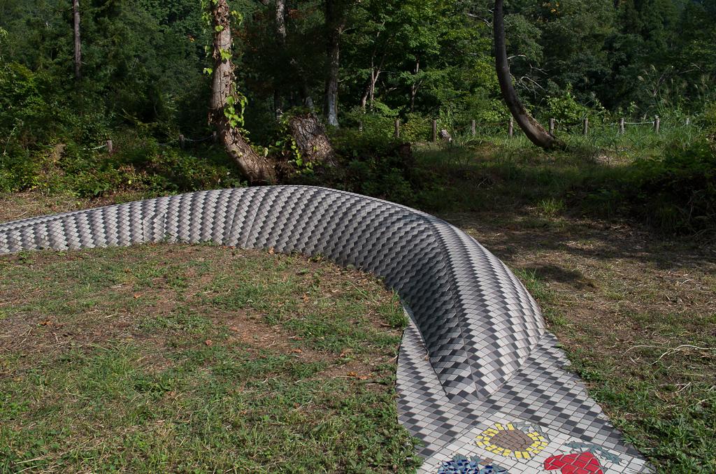 投稿日: 2012年9月10日2012年10月2日 投稿者: おフクぼくのなつやすみ -3日目 中編- さて、実はここにもトリエンナーレの作品があるのである。 一応、七ツ釜に合わせた作品。 もう、どう見ても蛇です、ネタバレです。 でも、最初に目に飛び込んできたのはココの部分。 アルマジロかとか思ったのはナイショですぞ。 さて、しっぽがあるからには頭は…と思っていたら… 案外長い(笑) ちょっとした山道を上っていく。 道は狭い。 やがてひらけたところに… いた(笑) 想像してたよりかわいらしいけど…ぺったんこ過ぎない? 最後は自分を撮って、なかさとエリア終了~!! 下りたり上ったり、ホントに疲れた~!! ページ: 1 2 3 4 5