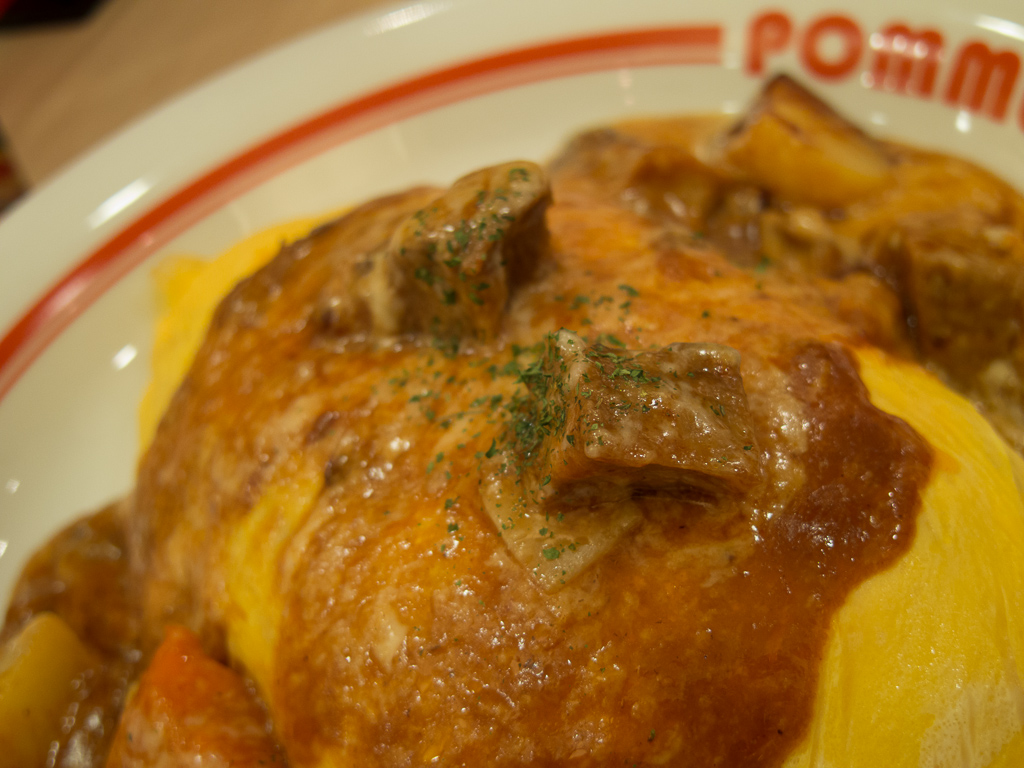 なんかチーズとビーフシチューのようなものがかかっているオムライス。