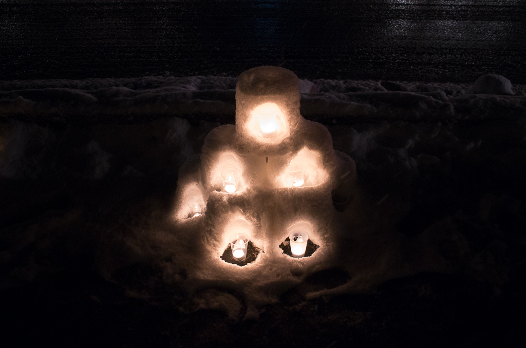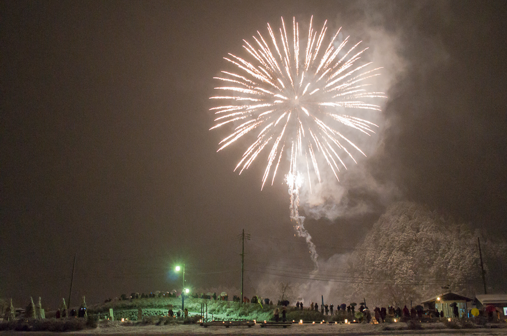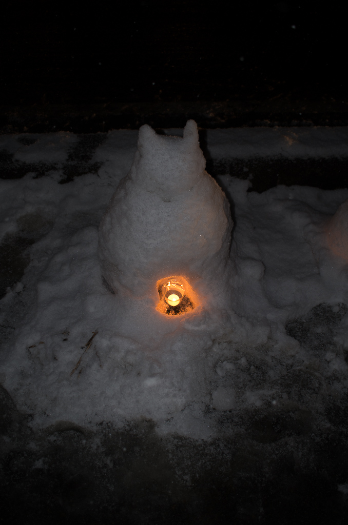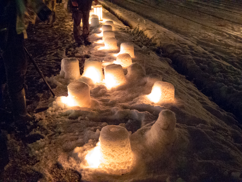 投稿日: 2013年1月26日2013年3月19日 投稿者: おフク美山 雪灯廊 -後編- 遊んでると、花火の時間に。 ずーっと待ってたよ~!! 前だけじゃ無くて、反響し色んな所から花火の音が聞こえるのが面白い。 こればっかりは、日記では表現出来ない…。 短い間だけど、雪の中の花火はとても不思議で美しい。 そしてフィニッシュ!! 素晴らしかった!! 田んぼのあぜ道から、バス停へ向かう。 雪の灯篭がほんのり足下を照らしてくれる。 暖かい光。 トトロ? 立体作品! 来年は作ってみようかなぁ…。 今年は雪が少なくて不安だったけど、とても貴重な体験が出来たと思う。 雪国って凄い!! そして、楽しかった!! あ、そうそう!! 帰りのバス停も凄いことになってた(笑) ページ: 1 2 3 4